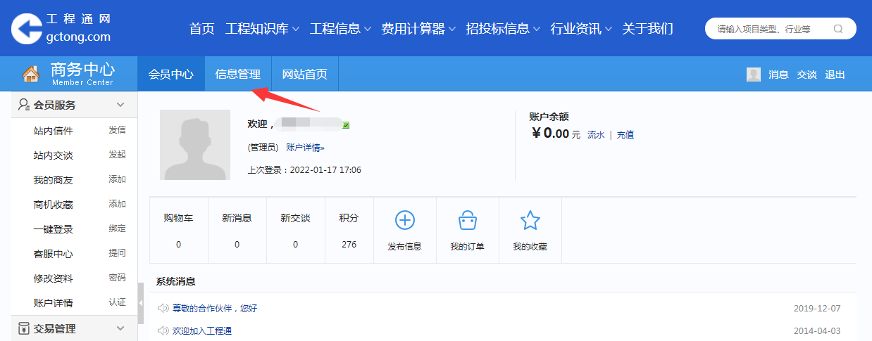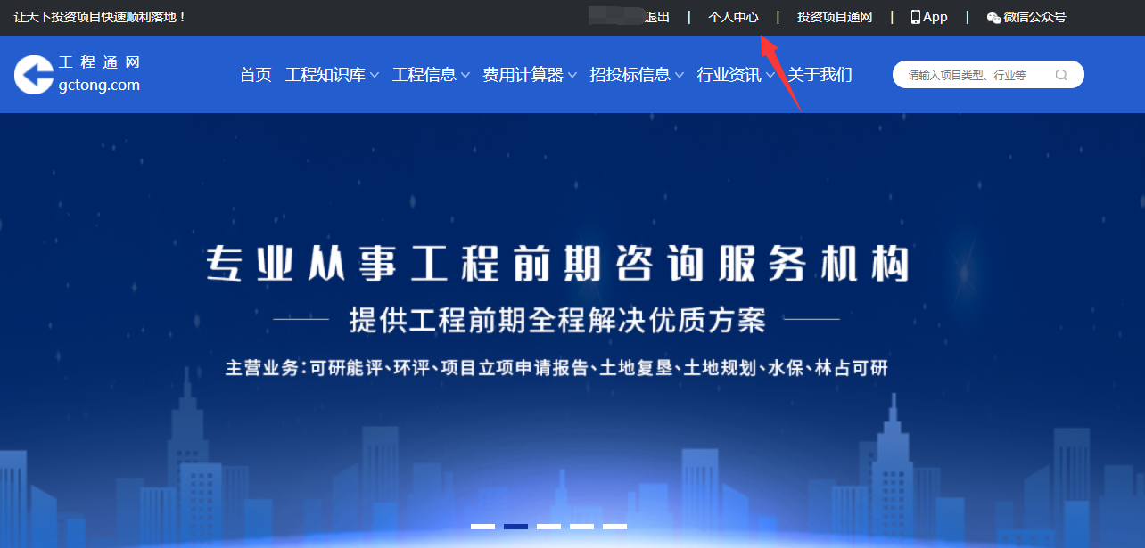 ②登錄完成后點(diǎn)擊首頁(yè)右上角“個(gè)人中心”,選擇“信息管理”,工程信息“發(fā)布”。