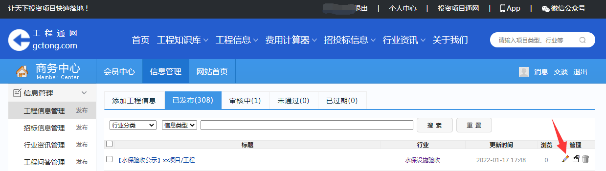 在首頁(yè)依次點(diǎn)擊“個(gè)人中心”“信息管理”、工程信息“管理”,在已發(fā)布一欄找到相應(yīng)項(xiàng)目,點(diǎn)擊后方鉛筆樣式的圖標(biāo)“修改”,其后分別是“復(fù)制”“刪除”功能。(盡量少修改,發(fā)布日期會(huì)相應(yīng)改變;或備注好公示時(shí)間)